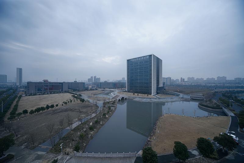 图书馆位于浙江学院的核心位置,设计将图书馆的体型定义为一个完整的立方体,以“独石”的姿态嵌固在圆形的微微隆起的场地中,只有西侧的主入口前厅以及东侧的室外草坡及小报告厅从独石中伸展出来。
