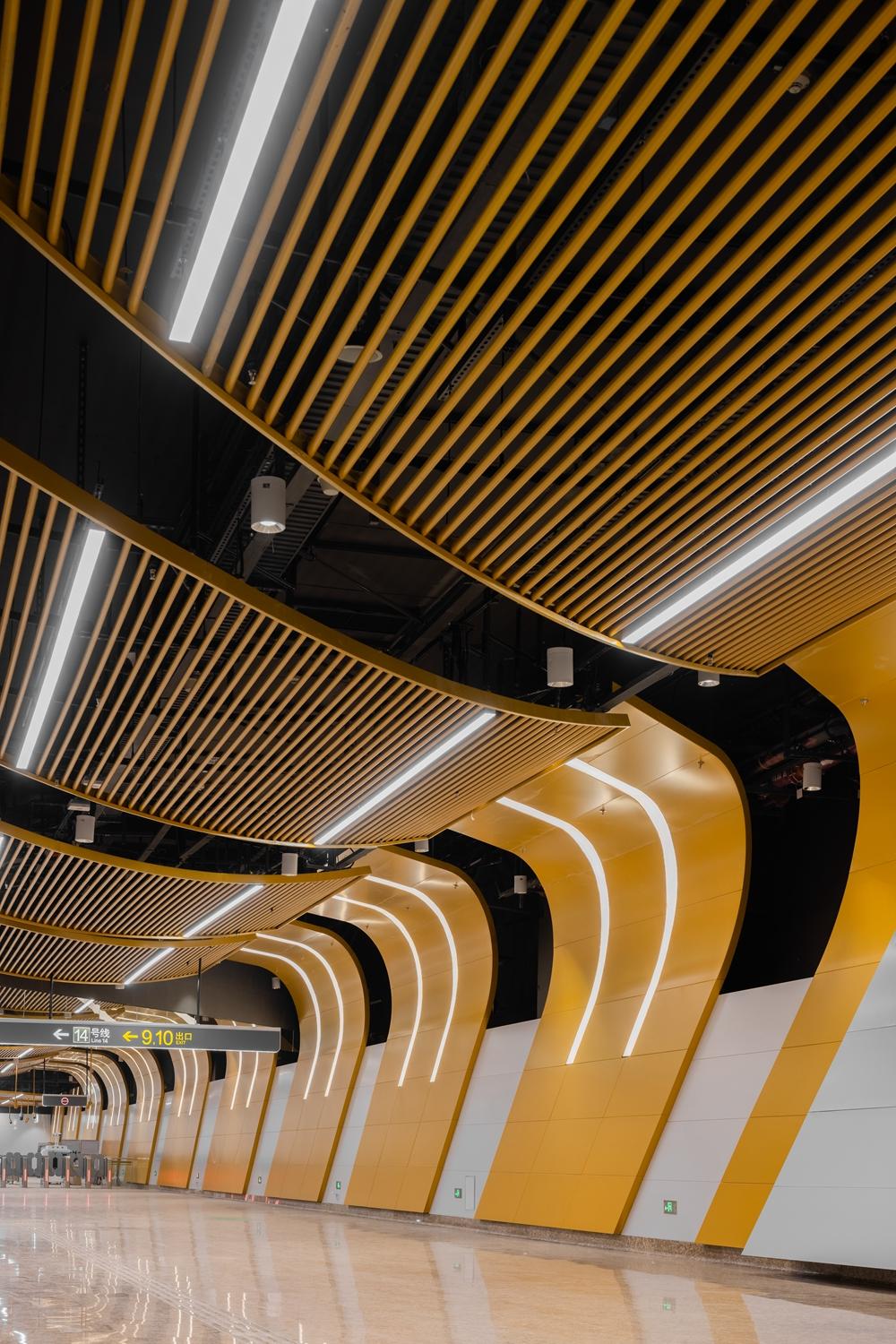 站台层装饰延续了站厅的金白色调,弧形铝板与格栅相互交错,如金色的海浪翻滚向前,象征着上海陆家嘴金融中心的冉冉升起,也展示出上海这座包容万象的国际化大都市的勃勃生机。