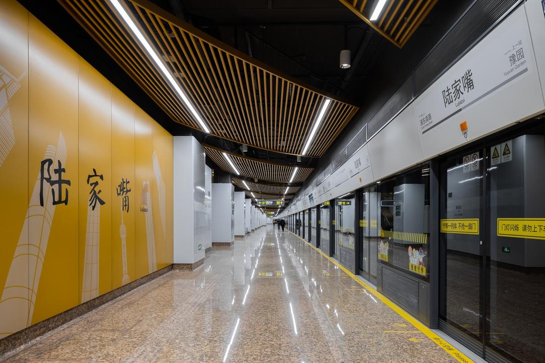 14号线陆家嘴站位于繁华的浦东陆家嘴金融区,因站位的特殊性,早在2010年上海国金中心建设时就已完成本站部分土建结构的代建工作。近10年来地铁功能不断优化提高,设计规范也在不断更新,为配合车站功能的优化提升,也为更好的服务市民使用,在14号线正式启动建设后,对已建半个车站土建结构进行了改造设计,并在此基础上对全站管线进行优化,进一步提升公共区净高。为解决现场施工产生的“声光尘”等问题,本站运用封闭式大棚,将工地隐匿在群楼之中,并通过多次的管线迁改、道路翻交保障了施工期间陆家嘴地区的交通畅通,市民工作生活正常有序。